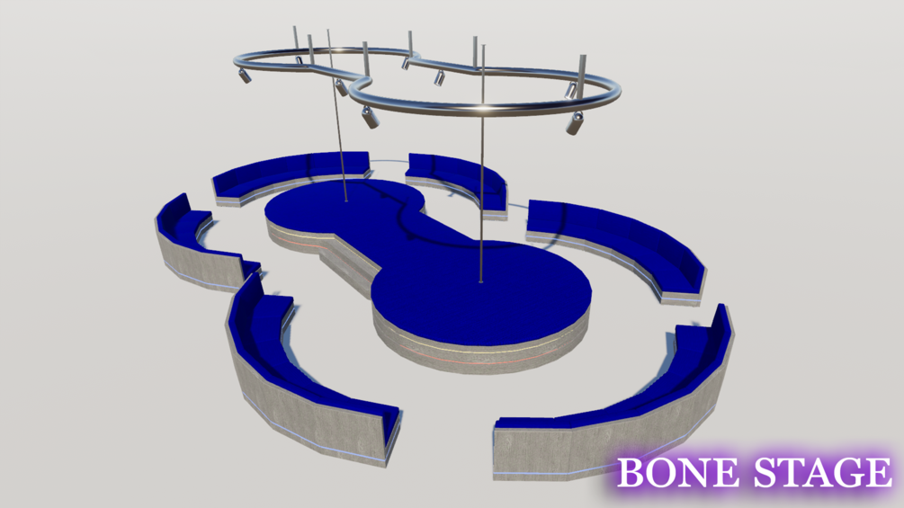 - lollipop stage with couches, a small railing on the bottom, light fixtures and a pole